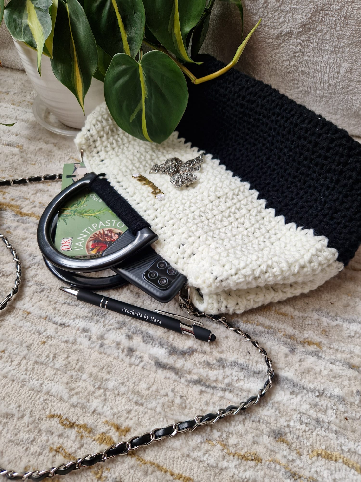 The Elegance Bow Crochet Handbag is a stunning blend of sophistication and handcrafted beauty. Featuring a chic black-and-white design, this bag is meticulously crafted from soft acrylic yarn, offering both durability and a luxurious feel.