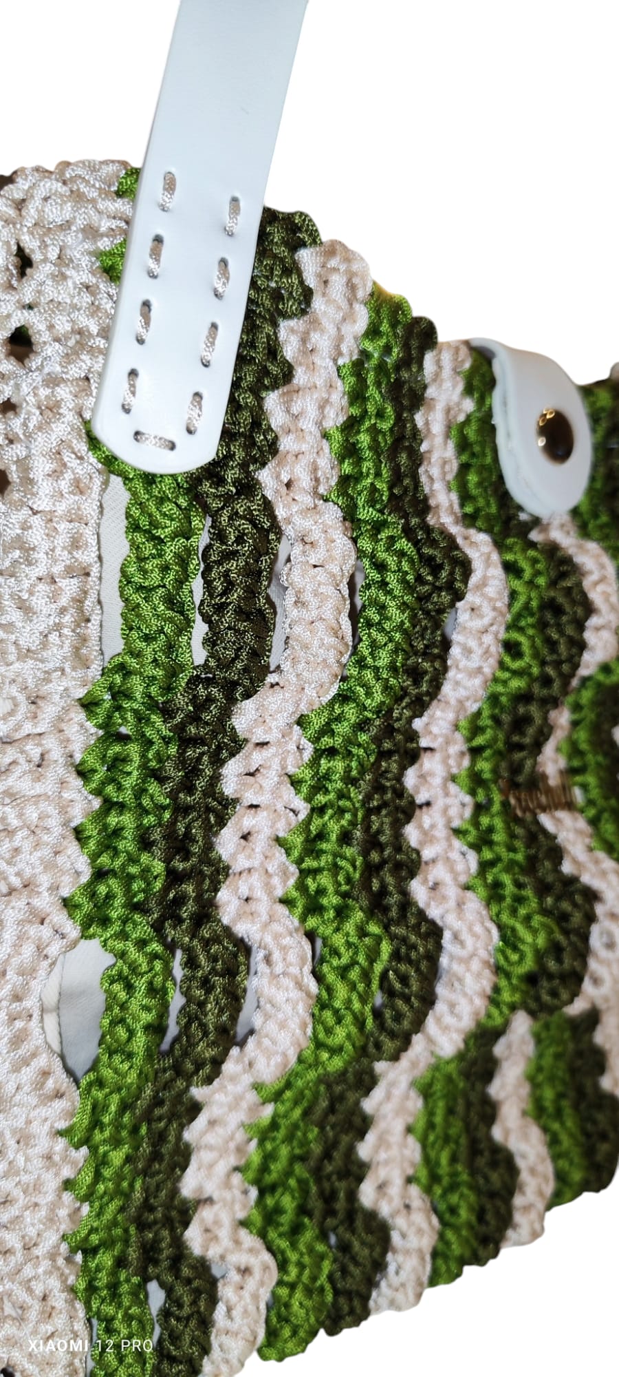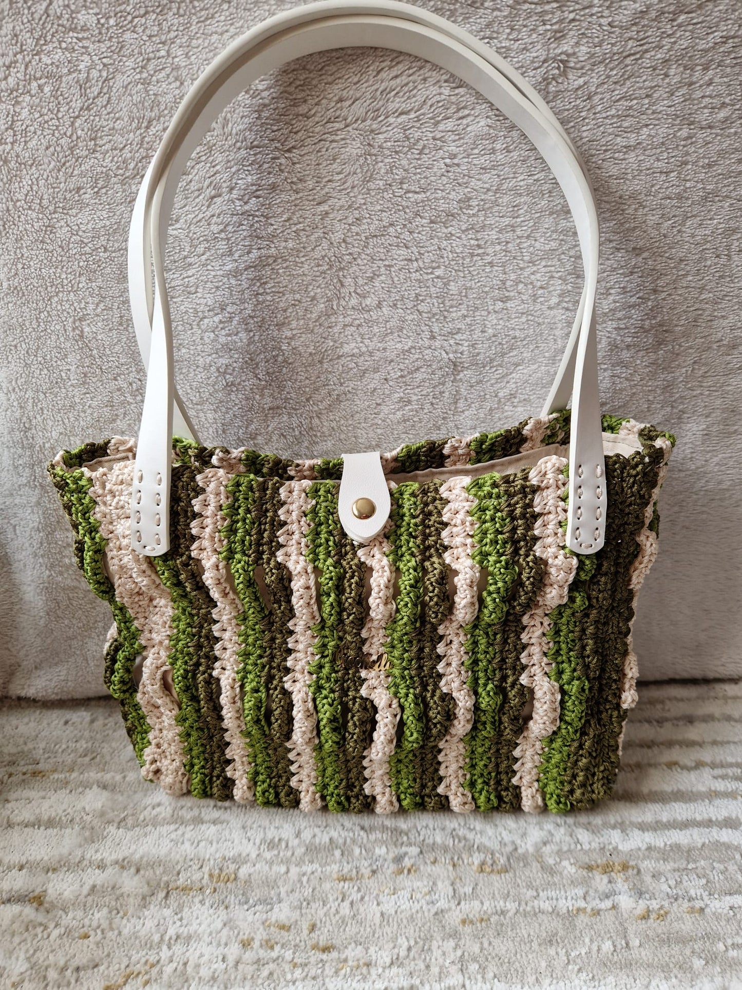Handcrafted with a stunning wave-like crochet pattern, the Forest Waves Crochet Bag brings a touch of organic beauty to your daily style. Made from linen nylon yarn, its rich blend of earthy green and soft beige hues creates a harmonious, textured design that stands out effortlessly.
